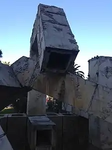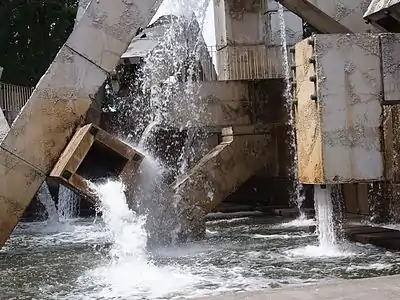 At the time of its dedication, the San Francisco chapter of the National Safety Council said that the fountain "may be a safety hazard".[10] Opponents of the work handed out leaflets at the dedication of the fountain describing it as a "loathsome monstrosity", a "howling obscenity", an "obscene practical joke", "idiotic rubble", and a "pestiferous eyesore".[5][34] Art critic Alfred Frankenstein of the San Francisco Chronicle responded that "its very outrageousness and extravagance are part of its challenge" and therefore, it "can't be all bad."[33] He added that the fountain was intended to be participated in rather than just observed.[5] An early comment by architecture critic Allan Temko, often repeated over the years, describes "technological excrescences" that had been "deposited by a giant concrete dog with square intestines".[33] Another pithy remark that gained press attention, from critic Lloyd Skinner, was that the fountain was "Stonehenge, unhinged, with plumbing troubles".[5]