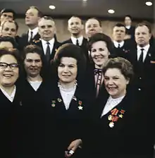 According to the Russian newspaper Pravda, one million flowers were brought in to celebrate the success of the dual flights and greet the cosmonauts in Moscow.[42] On 22 June 1963, Khrushchev greeted Bykovsky dressed in his uniform who saluted while Khrushchev hugged and kissed Tereshkova who was dressed in civilian attire. In front of the thousands in attendance, the Premier also announced that both the cosmonauts were awarded the Hero of the Soviet Union medal. All three made speeches from atop Lenin's Tomb on the Red Square; Tereshkova said, "my father perished defending our country and my mother brought up her three children. We know the bitterness of that war. We don't need war," referring to the anniversary of the German invasion of Russia that began 22 years ago that day.[43] Sometime after her mission, she was reportedly asked how the Soviet Union should thank her for her service to the country; Tereshkova requested that the government search for and publish the location of where her father was killed in action. This was done, and a monument was erected at the site in the Lemetti, Karelia—now on the Russian side of the border.[1] The evening of 22 June, a reception was held in the Kremlin in which both Bykovsky and Tereshkova were awarded the Order of Lenin.[43]