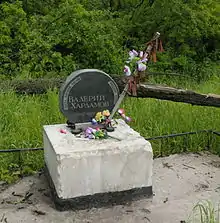 Kharlamov was still active with CSKA when he was killed in a car accident on 27 August 1981.[17] Prior to the accident, Kharlamov had been informed that he would not be a member of the Soviet team playing in the 1981 Canada Cup.[21] Coach Viktor Tikhonov said that Kharlamov was left off the team over concerns about his conditioning.[3] Irina, Kharlamov's wife, was driving back to Moscow from the family's cottage when she lost control and crossed into opposing traffic, hitting a truck head-on.[2] Irina did not have a driver's licence at the time of the crash. When the bodies were recovered, Kharlamov was reaching over from his seat, holding onto the steering wheel.[3] Irina's cousin was also killed.[2] Fans lined the streets during his funeral procession in Moscow, and they filed past his casket which rested at centre ice of CSKA's arena.[3] Near the scene of the crash, a memorial stone in the shape of a hockey puck is inscribed, "The star of Russian hockey fell here."[17]