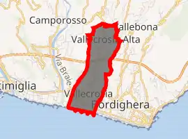 Vallecrosia (Ligurian: Vallecrösia or Vallecrösa[3]) is a comune (municipality) in the Province of Imperia in the Italian region Liguria, located about 120 kilometres (75 mi) southwest of Genoa and about 30 kilometres (19 mi) west of Imperia. It is next to the busy city of Ventimiglia.