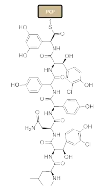 Nonribosomal peptide synthesis occurs through distinct modules that can load and extend the protein by one amino acid per module through the amide bond formation at the contact sites of the activating domains.[41] Each module typically consists of an adenylation (A) domain, a peptidyl carrier protein (PCP) domain, and a condensation (C) domain. In the A domain, the specific amino acid is activated by converting into an aminoacyl adenylate enzyme complex attached to a 4'phosphopantetheine cofactor by thioesterification[42][43] The complex is then transferred to the PCP domain with the expulsion of AMP. The PCP domain uses the attached 4'-phosphopantethein prosthetic group to load the growing peptide chain and their precursors.[44] The organization of the modules necessary to biosynthesize Vancomycin is shown in Figure 1. In the biosynthesis of Vancomycin, additional modification domains are present, such as the epimerization (E) domain, which isomerizes the amino acid from one stereochemistry to another, and a thioesterase domain (TE) is used as a catalyst for cyclization and releases of the molecule via a thioesterase scission.