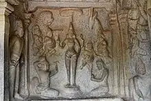At the centre of the rear wall of the mandapa, opposite to the entrance, guardian figures are carved on either side of a shrine. Inside the mandapa, the walls have four large sculptured panels, good examples of naturalistic Pallava art. The side walls have carved sculpture panels of Vishnu as Trivikrama (Vamana) and northern panel, which is very large, depicts Vishnu in the form of Varaha, the boar, lifting Bhudevi, the earth goddess symbolically representing removal of ignorance of human beings. In this panel, Varaha has four hands, two arms carrying shankha and chakra, which are shown towards the back and in one of the arms in the front he is carrying Bhudevi. There are no attendants fawning on him. However, the original panel has been plastered and painted.[1][8][4][12]