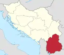 It was located in the southernmost part of the country, encompassing the whole of today's North Macedonia, southern parts of Southern and Eastern Serbia and southeastern parts of Kosovo and Serbia. It was named after the Vardar River and its administrative capital was the city of Skopje. According to the 1930 statistics of the Central Press Bureau of the Ministerial Council[1] out of the 9 Yugoslav banovinas, the "Vardarska" banovina was the largest at 38,879 km2 (15,011 sq mi); while its population, was the fourth at 1,386,370 inhabitants. Following the First World War in Vardar Macedonia and the so called Western Outlands, the local Bulgarian/Macedonian population was not recognized and state-policy of Serbianisation occurred.[2][3][4] It also suffered the worst health problems, especially typhus and smallpox, and required one Institute of Hygiene, 3 health stations and 6 dispensaries and convalescent homes. On the other hand, unlike the banovinas that until the creation of Yugoslavia had belonged to the Austro-Hungarian empire and the lands of Montenegro, it had inherited no debts. According to the 1931 Constitution of the Kingdom of Yugoslavia, the Vardar Banovina was bounded on the north by the boundaries of the Zeta and Morava Banovinas, and on the east, south and west by the State frontiers with Bulgaria, Greece, and Albania. In 1941, the World War II Axis Powers occupied the Vardar Banovina and divided it between Bulgaria, German-occupied Serbia, and Albania under Italy. Following World War II, the southern portion of the region became Socialist Republic of Macedonia while the northern portions were made a part of the Socialist Republic of Serbia, both within the Socialist Federal Republic of Yugoslavia.