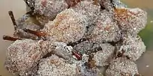 In pre-revolutionary Russia, "dry varenye" (Russian: сухое варенье, sukhoe varenye) referred to a local variety of candied fruits (fruit confit) obtained by extracting fruits from varenye syrup and drying them. Kyiv (today the capital of Ukraine) was particularly famous for this delicacy.[1][6][7]