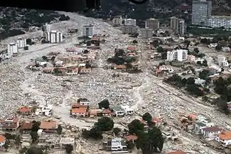 The Vargas tragedy was a natural disaster that occurred in Vargas State, Venezuela on 14–16 December 1999, when torrential rains caused flash floods and debris flows that killed tens of thousands of people, destroyed thousands of homes, and led to the complete collapse of the state's infrastructure. According to relief workers, the neighborhood of Los Corales was buried under 3 metres (9.8 ft) of mud and a high percentage of homes were simply swept into the ocean. Entire towns including Cerro Grande and Carmen de Uria completely disappeared. As much as 10% of the population of Vargas died during the event.[2]