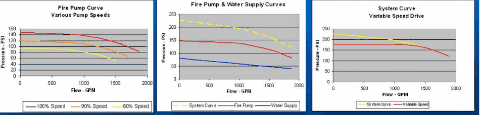 - Energy Savings – "Most motors turn at nearly constant speed. However, much of the time the devices they drive operate at less than maximum design speed. This reduction can be accommodated by an Adjustable Speed Drive (ASD) that varies the shaft speed to the driven load. Slowing a pump or motor in this manner reduces the energy consumption much more effectively than allowing the motor to run at constant speed and then restricting or bypassing the flow with a valve or damper...if shaft speed is reduced 10%, flow is reduced by 10%, while power consumption is reduced 27%."[6]However, due to the limited operating hours of a fire fighting pump, the total energy savings will be minimal for this type of application, compared to the initial investment.