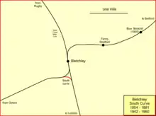 The Buckinghamshire Railway connection at Bletchley left in a southward direction, and a west to south chord was brought into use there in October 1854 to permit direct running between Euston and the Buckinghamshire line.[4]
