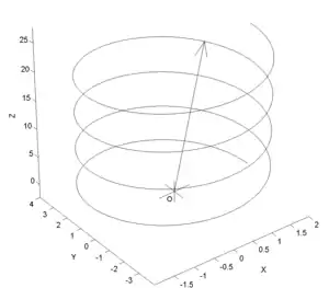 The vector shown in the graph to the right is the evaluation of the function near t=19.5 (between 6π and 6.5π; i.e., somewhat more than 3 rotations). The helix is the path traced by the tip of the vector as t increases from zero through 8π.