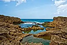 The abundant fertility of its soil, has meant Vega Baja has much agricultural and farming land. In addition, Vega Baja has one of the most visited beaches of the northern coastline, Playa de Puerto Nuevo (Playa Mar Bella). This beach attracts thousands of beachgoers annually, making it a center for local tourism, especially during the hot summer months.[21] It boasts a natural rock formation of enormous proportions both in height and length colloquially named La Peña. This rock feature shelters the beach portion from the open seas just behind it. During rough marine conditions, the rock feature protects beachgoers, while the spectacle of waves crashing from behind and cascading down its face can be appreciated in the relative safety of the beach.[22]