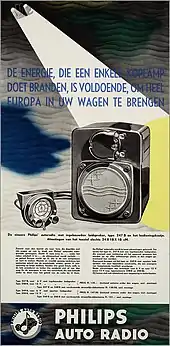 A 1950s Philips car radio using both transistor and valves. This model used a range of valves that only required 12 volts for their plate (anode) voltage.[34]