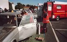 - the protection of the incident scene, to avoid a risk of another collision (marking out the scene with cones or flares (inadvisable if gasoline is leaking), lighting) and of fire (e.g. switching off the ignition, putting vehicle in park, disconnecting the battery, placing absorbing powder on oil and gasoline pools, fire extinguisher and fire hose ready to use); It is very common to use emergency vehicles as road blockers at crash scenes.