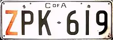 These plates were on a black on white background, usually marked with "C of A" at the top of the plate – an abbreviation of Commonwealth of Australia and the leading Z being red to further distinguish it from other state plates.