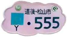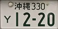 In addition to plate size and color, Japanese plates since 1962 have identified the vehicle type (signified by length, width and height as well as engine displacement) by use of a vehicle class code signified by a number on the top line of the plate for all vehicles with three or more wheels.[3] The vehicle class code system is not widely understood outside of Japan, and as a result, Japanese vehicles displaying "vanity" Japanese license plates at overseas shows and events are often unwittingly misrepresented.