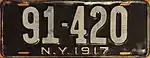 1917 | Embossed white serial on dark olive green plate with border line; "N.Y. 1917" centered at bottom | none | 123-456 A123-456 B123-456 |
