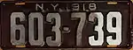 1918 | Embossed white serial on maroon plate with border line; "N.Y. 1918" centered at top | none | 123-456 | Single series of all-numeric serials used for all classes of vehicles, with blocks allocated to passenger vehicles in each of the three districts (above). This practice continued through 1921.[3] | |