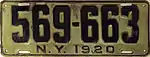 1920 | Embossed black serial on light green plate with border line; "N.Y. 1920" centered at bottom | none | 123-456 | ||