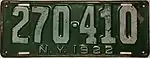 1922 | Embossed white serial on green plate with border line; "N.Y. 1922" centered at bottom | none | 123-456 1-234-567 |