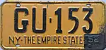 1951–52 | Embossed black serial on golden yellow plate; "NY", slogan and "51" at bottom | "THE EMPIRE STATE" between state abbreviation and year | A-12-34 1A12-34 AB12-34 |