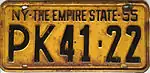 1955–56 | Embossed black serial on golden yellow plate; "NY", slogan and "55" at top | "THE EMPIRE STATE" between state abbreviation and year | A-12-34 1A12-34 AB12-34 |