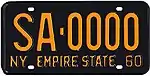 1958–59 | Embossed black serial on golden yellow plate; "NY", slogan and "58" at bottom | "EMPIRE STATE" between state abbreviation and year | A-1234 AB-1234 1234-A 1234-AB 1A-1234 |