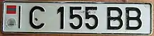 Standard license plates of Transnistria are 520 mm wide and 112 mm high, made of metal with 6 embossed characters - one letter, three numbers and two more letters - written using the DIN 1451 Mittelschrift font. On the left part of the plates there also a modified euroband on a white background, having the flag of the PMR instead of the EU symbol, and a holographic sticker in the place of the international country code underneath it. Government plates only have 5 embossed characters - three numbers and two letters. Only symbols that are common to both the Cyrillic and the Latin alphabets are used, and with their Cyrillic meaning (A, B, C, E, H, K, M, P, T, X, Y). Its current design derives from Moldovan plates of 1992 design, but is slightly changed. Military plates are using Soviet design from 1959, and tractor plates are also using Soviet design, but from 1980.