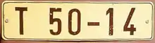 The plates' appearance remained largely constant during the 37 years in which they were issued. Black alphanumerics rendered in a condensed version of DIN 1451 were used (although other fonts have also been observed),[1] with the first letter indicating the bezirk (the German word for 'district') where the vehicle was registered. Between 1953 and 1974, the format of these plates was XX ##-##, where X is any letter in the range A-Z, and # is a digit between 0 and 9 – although a numerical prefix and/or suffix of '00' was disallowed.
