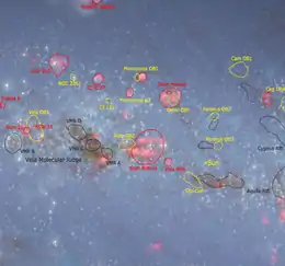Part of the gas in the clouds is ionized by the ultraviolet radiation of some of the most massive stars associated with the complex, constituting H II regions of great extent, as Gum 14 (RCW 27) and Gum 20 (RCW 36). Stellar formation activity is confirmed by the discovery of several associations of T Tauri stars, particularly in the VMR D cloud,[5] as well as by the presence of several open clusters heavily obscured and deeply immersed in the gas observable at infrared wavelengths.[6]