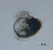 The veliger is the second larval stage in the development of gastropods, following the earlier trochophore stage. In some species, including virtually all pulmonates, the veliger stage is passed within the egg capsule and the hatching stage is a juvenile rather than a free-living larva. In species with a larval stage, the veliger is exclusively aquatic. Free-living veliger larvae typically feed on phytoplankton; however, the larvae of some species are lecithotrophic (nourished by yolk from the egg that is retained within their bodies) and do not need to feed. In at least some cases, lecithotrophic veligers can also feed on phytoplankton.[1]