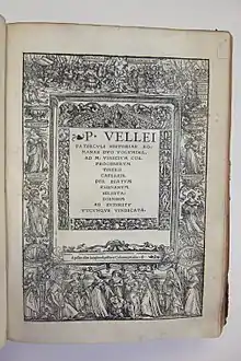 Velleius' treatise was not intended as a careful and comprehensive study of history. The author acknowledged as much, and stated his desire to write a more detailed work, which he indicated would give a fuller account of the Civil War, and the campaigns of his patron, Tiberius, but there is no reason to believe that he ever did so.[2] His history does not seem to have been widely known in antiquity. According to the scholiast, he was read by Lucan; the Chronica of Sulpicius Severus seems to have been modeled on Velleius' history; and he is mentioned by Priscian, but this seems to be the extent of his influence prior to the discovery of a badly damaged manuscript at Murbach Abbey in Alsace in 1515. Although corrupt and since lost, this formed the basis for the editio princeps published by Beatus Rhenanus in 1520, and a later copy acquired by Orelli.[2][5]