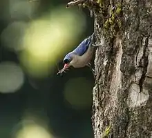Like other nuthatches they have strongly curved claws[15] that allow them to climb down vertical tree trunks, unlike species such as woodpeckers that only work their way upwards. It moves jerkily up and down or around tree branches and trunks. It is an active feeder on insects and spiders, gleaned on the bark of the trunk and branches, and may be found in mixed feeding flocks with other passerines.[16][17] The insects they disturb are sometimes taken by the racket-tailed drongo in Sri Lanka.[18]