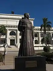 Junípero Serra, first leader of the Franciscans in California, founded Mission San Buenaventura in 1782 as his ninth and last mission established near the Chumash village as part of Spain's colonization of Alta California.[19] The mission was named for St. Bonaventure, a Thirteenth Century Franciscan saint and a Doctor of the Church. San Miguel Chapel was the first outpost and center of operations while the first Mission San Buenaventura was being constructed. The first mission burned in 1801 and a replacement building of brick and stone was completed in 1809. The bell tower and facade of the new mission was destroyed by an 1812 earthquake.[20][21] The Mission was rebuilt and functions as a parish church. Historic tours of downtown include the mission compound.