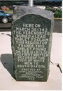 The lead plate was found at Pierre, South Dakota, in 1913 and is now in the South Dakota Cultural Heritage Center in Pierre. It is six by eight inches and similar to ones placed in the Ohio Valley. The front has a die-stamped Latin inscription referring to Louis XV, Pierre La Vérendrye and the year 1741. On the back is hastily scratched "Placed by Chevalyet de Lave; [garbled] Louis la Londette, A Miotte; 30 March 1743". Londette and Miotte are probably the two other Frenchmen who are otherwise undocumented. The garbled part was first read as "t b St" for Toussaint, assumed to be the first name of Londette. Hubert Smith read "Lo Jost" for Louis-Joseph. The Dictionary of Canadian Biography has "tblt" for Tremblet or Trembey, part of François' name.