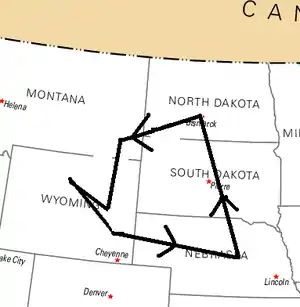 The assembled tribes broke up into smaller groups "to obtain meat more easily." The brothers remained with the Bow People until 1 March, traveling east-southeast.[lower-alpha 13] One Frenchman and a guide were sent ahead to contact the Little Cherry People (Gens de la Petite Cerise, possibly Chokecherry People).[lower-alpha 14] Ten days later the Frenchman returned with an invitation to join these people. On 15 March they reached the Chokecherry People who were returning to their fort on the Missouri River. At the fort they met a man who had been brought up among the Spanish who said that they were twenty days away by horseback, but the journey was dangerous because of the Snake People.[lower-alpha 15] They also heard of a Frenchman who was living three days journey away.[lower-alpha 16] On 30 March they buried a lead plate recording their journey.[lower-alpha 17]