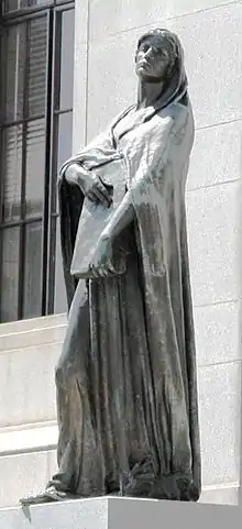 In Roman mythology, Veritas (Classical Latin: [ˈweː.rɪ.t̪aːs]), meaning truth, is the goddess of truth, a daughter of Saturn, called Cronus by the Greeks, the Titan of Time, perhaps first by Plutarch, and the mother of Virtus. She is also sometimes considered the daughter of Jupiter, called Zeus by the Greeks,[1] or a creation of Prometheus.[2][3] The elusive goddess is said to have hidden in the bottom of a holy well.[4] She is depicted both as a virgin dressed in white and as the "naked truth" (nuda veritas) holding a hand mirror.[5][6][7]