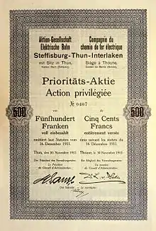 STI was formed in December 1911, originally as the Elektrische Bahn Steffisburg-Thun-Interlaken (English: Steffisburg–Thun–Interlaken Electric Railway),[3] and began carrying passengers on 10 October 1913, with the opening of a tram line between Steffisburg and Oberhofen (via Thun), which was later extended to Beatenbucht and finally to Interlaken. Plans for road rebuilding led to the closure of the Beatenbucht–Interlaken section of tramway in 1939, but trams continued to provide the Thun–Beatenbucht service, STI's main line, until 1952.[3] The Thun–Steffisburg tram line closed in 1958, and since then the STI network has been covered exclusively by buses. Trolleybuses, powered by electricity drawn from overhead wires, were used on the main line, Thun–Beatenbucht, connecting at Beatenbucht with the Thunersee–Beatenberg funicular and with a motorbus route covering the section to Interlaken.[3] In 1982, the trolleybuses were replaced with conventional, diesel-powered buses. STI introduced its first night service in 1993, between Thun and Bern. Further extensions made to the network in 1999 and 2001 took STI buses into areas such as Gwatt, which had seen railway station closures.