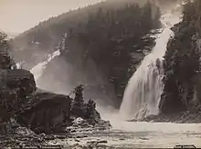 The river Verma flows in steep cascades, splits in three canals, and finally drops about 50 metres (160 ft) into the main river. The total height is about 380 metres (1,250 ft) along the 1,000 metres (3,300 ft) of the Verma river.[2] In the world waterfall database it is listed as the 242nd tallest in the world.[3] The valley of the Verma river is a typical "hook-valley" (agnordal) as Verma river in prehistory was a tributary to Gudbrandsdalslågen to the east. As the Rauma river gradually dug into the bedrock in upper Romsdalen valley the watershed shifted east and Verma river was captured by Rauma river. Hans Reusch described this peculiarity of the Scandinavian divide in 1905. The hook-valley phenomenon is particularly visible around the Romsdalen/Eikesdalen and northern Gudbrandsdalen.[4][5]