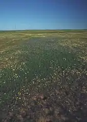 Vernal pools are so called because they are often, though not necessarily, at their maximum depth in the spring ("vernal" meaning of, relating to, or occurring in the spring). There are many local names for such pools, depending upon the part of the world in which they occur. Vernal pools may form in forest, but they are more typically associated with grassland and rocky plains or basins. While many vernal pools are only a few meters in width, playas and prairie potholes are usually much larger, but still are otherwise similar in many respects, with high water in wet periods, followed by dry conditions.[4] Some exclude desert playas from the definition of vernal pools because their larger closed drainage basins in areas with high evaporation rates produce higher concentrations of dissolved minerals, with salinity and alkalinity favoring different species. Playas may be inundated less frequently than vernal pools, and inundation typically coincides with colder weather unfavorable for plant growth.[5]