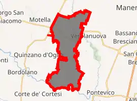 Verolavecchia (Brescian: Erölaecia) is a comune in the province of Brescia, in Lombardy. Bordering communes are Borgo San Giacomo, Corte de' Cortesi con Cignone (CR), Pontevico, Quinzano d'Oglio, Robecco d'Oglio (CR) and Verolanuova. Its coat of arms shows three ears of wheat, the text Vetus Virescit and a white cross on blue.[3]