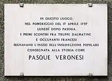 The Veronese Easter (Italian: Pasque Veronesi, or singular Pasqua Veronese; French: Pâques véronaises)[2] was a rebellion during the Italian campaign of 1797, in which inhabitants of Verona and the surrounding areas revolted against the French occupying forces under Antoine Balland, while Napoleon Bonaparte (the French supreme commander in the Italian campaign) was fighting in Austria. The uprising received its name through association with the anti-French uprising of the Sicilian Vespers of the 13th century.[3] Incited by oppressive behaviour by the French (confiscating the assets of Verona's citizens and plotting to overthrow the city's local government), it began on the morning of 17 April 1797, the second day of Easter: the enraged population succeeded in defeating more than a thousand French soldiers in the first hour of fighting, forcing them to take refuge in the town's fortifications, which the mob then captured by force. The revolt ended on 25 April 1797 with the encirclement and capture of the town by 15,000 soldiers, who then forced it to pay a huge fine and hand over various assets, including artwork.