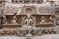 The temple is carved out from a single rock in a rectangular portion measuring 7.5 m (25 ft) in depth. The carvings in the temple show the top portion of the temple, with an unfinished bottom. The sculptures and the carvings are indicative of Pandyan art during the period.[3] The granite rock looks like a blooming lotus, with hills surrounding it on three sides. The vimana (ceiling over the sanctum) has niches of Parsavadevatas, the attendant deities of Shiva, like ganas, Dakshinamurthy depicted playing a mridanga, Siva with his consort Uma, dancers, various niches of Nandi (the sacred bull of Shiva) and animals like monkeys and lions. Historian Sivaramamurti states that this is the only site where Dakshinamurthy is depicted playing the Mridanga (a percussion instrument), while in all other places, he is depicted playing Veena. According to epigrapher V. Vedachalam, there is a spontaneity in the sculptures indicating of natural human movements like in the Shiva and Uma sculpture where they seem to be talking like common folks.[4] The Vettuvan Koil is an unfinished Shiva temple.