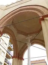 Sources indicate that it was in 1482[22] that the corregidor[23] or asistente[6] of Seville, Don Diego de Merlo, substituted a stone cross and covered it with a Templete in the Mudéjar style,[4] 13 metres (43 ft) in height.[23] That date seems particularly probable because that year the archdiocese received an ostensible relic of the True Cross.[4] However, the words written inside the dome of the Templete giving that date only date from 1881.[24]