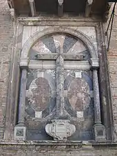 The original Via Crucis initiated by the Marquis of Tarifa began inside the Casa de Pilatos in the Chapel of the Flagellations and ended at a pillar near the current Templete (small temple).[2] Beginning in 1630, both the beginning and end of the route changed,[2] beginning at the current shrine with its marble altarpiece erected that year on the façade of the Casa de Pilatos,[3][6] and ending at the Templete.[2] The simple wooden Cruz de las Toallas (literally "Cross of the Towels") that previously marked the first station passed into the possession of the Hermandad de los Negritos[6] (for whom see below).