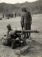 The British Army formally adopted the Vickers gun as its standard machine gun under the name Gun, Machine, Mark I, Vickers, .303-inch on 26 November 1912.[15] There were still great shortages when the First World War began, and the British Expeditionary Force was still equipped with Maxims when sent to France in 1914.[16] Vickers was, in fact, threatened with prosecution for war profiteering, due to the exorbitant price it was demanding for each gun. As a result, the price was slashed. As the war progressed, and numbers increased, it became the British Army's primary machine gun, and served on all fronts during the conflict. When the Lewis Gun was adopted as a light machine gun and issued to infantry units, the Vickers guns were redefined as heavy machine guns, withdrawn from infantry units, and grouped in the hands of the new Machine Gun Corps (when heavier 0.5 in/12.7 mm calibre machine guns appeared, the tripod-mounted, rifle-calibre machine guns like the Vickers were re-classified as "medium machine guns"). After the First World War, the Machine Gun Corps (MGC) was disbanded and the Vickers returned to infantry units. Before the Second World War, there were plans to replace the Vickers gun as part of a widescale change from rimmed to rimless rounds; one of the contenders was the 7.92mm Besa machine gun (British-built Czech ZB-53 design), which eventually became the British Army's standard tank-mounted machine gun. However, the Vickers remained in service with the British Army until 30 March 1968. Its last operational use was in the Radfan during the Aden Emergency. Its successor in UK service is the British L7 variant of the FN MAG general purpose machine gun.