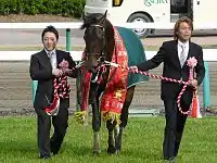 On his first appearance as a four-year-old, Victoire Pisa started the 2/5 favourite for the Nakayama Kinen over nine furlongs on 27 February. He took the lead in the straight and won comfortably by two and a half lengths from Captain Thule. The colt was then sent to the United Arab Emirates to contest the Dubai World Cup at Meydan Racecourse on 26 March. The race was run over ten furlongs on a synthetic Tapeta footings surface and attracted runners from Britain, Ireland, South Africa, Saudi Arabia and the United States. Demuro restrained the colt in last place before moving up to join the leaders half a mile from the finish of a slowly run race. He took the lead in the straight and held off the challenge of his fellow Japanese challenger Transcend by half a length with Monterosso in third and Cape Blanco in fourth.[11] Victoire Pisa became the first Japanese-trained horse to win the "world's richest race".[12][13] The victory was an emotional one for the Japanese contingent, coming less than three weeks after the country had been struck by an earthquake and tsunami: Demuro returned to the winner's enclosure in tears, whilst Katsuhiko Sumii said that he felt that "the whole country was behind me."[13] Victoire Pisa was sent to Europe again but did not contest any races after sustaining a series of leg injuries.[14]