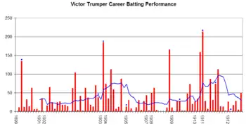 Some notable highlights of Trumper's career include scoring 292 against Tasmania, including a century before lunch (1908); scoring 100 in 58 minutes against Victoria (1906); 201 against South Australia (1913).[2] His innings of 293 for an Australian XI against Canterbury (1914), scored in a little over three hours, was made in partnership with Arthur Sims (184 not out), and their stand of 433 still remains the record for the eighth wicket in first-class cricket, and Trumper's innings remains the highest score by a number nine batsman.[62][63]