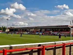 The Traditional Builders & Contractors Ltd Stand at the west end of the ground (Pondfield Road end) was built during the close season of 2009; it has a capacity of 1,240 and is all seated. Access to the away stand is via gates at the far end of the ground from the entrance via Victoria Road. The stand has disabled facilities, and also incorporates a bar, snack bar, and new club office and changing facilities. The players now emerge onto the pitch from a tunnel in the stand (left) rather than the old tunnel in the middle of the Carling Stand.