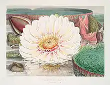 The species captured the imagination of the public, and was the subject of several dedicated monographs. The botanical illustrations of cultivated specimens in Fitch and W.J. Hooker's 1851 work Victoria Regia[13] received critical acclaim in the Athenaeum, "they are accurate, and they are beautiful".[14] The Duke of Devonshire presented Queen Victoria with one of the first of these flowers, and named it in her honour. The lily, with ribbed undersurface and leaves veining "like transverse girders and supports", was Paxton's inspiration for The Crystal Palace, a building four times the size of St. Peter's in Rome.[15]