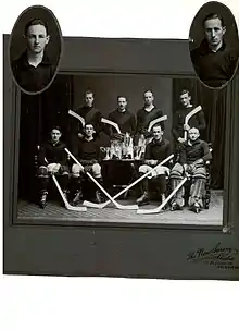 For the 2nd season, the association ran under the auspices Victorian Amateur Ice Hockey and Sports Association and from the local competition, players would be selected to represent Victoria in the annual Inter-State Series.[14] The first game of the season began at 9:00 pm at the Melbourne Glaciarium on 22 June 1910 between Beavers Ice Hockey Club and Brighton Ice Hockey Club resulting in a 5–3 win for Brighton.[15] The playoff champions were the Melburnian Ice Hockey Club, who are seen posed with a trophy cup.