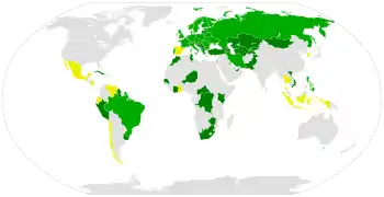 The Vienna Convention on Road Traffic was concluded at Vienna on 8 November 1968. Since its entry into force on 21 May 1977, in signatory countries ("Contracting Parties") it replaces previous road traffic conventions, notably the 1949 Geneva Convention on Road Traffic, in accordance with Article 48 of the Convention. The convention has been ratified by 83 countries, but those who have not ratified the convention may still be parties to the 1949 Geneva Convention on Road Traffic. Ireland, Canada, the United States, Cyprus, Iceland, Malta, China and Malaysia are examples of non-signatory countries. Several other countries, such as Spain and Mexico, have signed the convention but have not ratified it.[2]