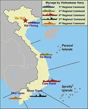 - 1st Regional Command (A Regional Command): Gulf of Tonkin, north coast from Quảng Ninh to Hà Tĩnh and the islands in Gulf of Tonkin. Command Headquarters: Hai Phong.